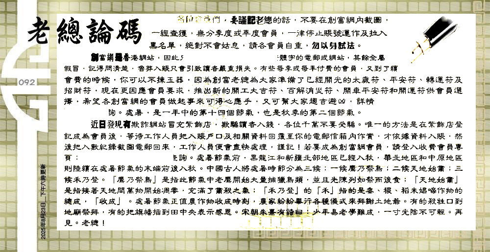 主题 :092期:六合皇金句/老总论码/萧公子/林大师/五行夺码/老总信箱截