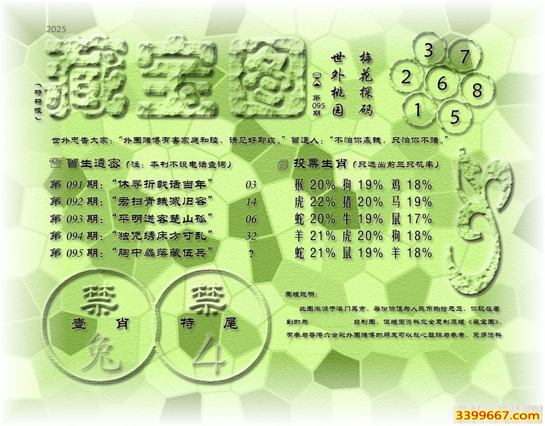 主题 :095期藏寶圖 新:碧落千门锁元气 老:胸中磊落藏伍兵 禁:兔 禁:4尾