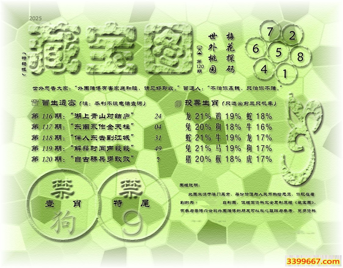| 主题 :120期藏寶圖 新:荒园茅塞闭墙隈 老:自古骄兵多致败 禁:狗 禁:9 |